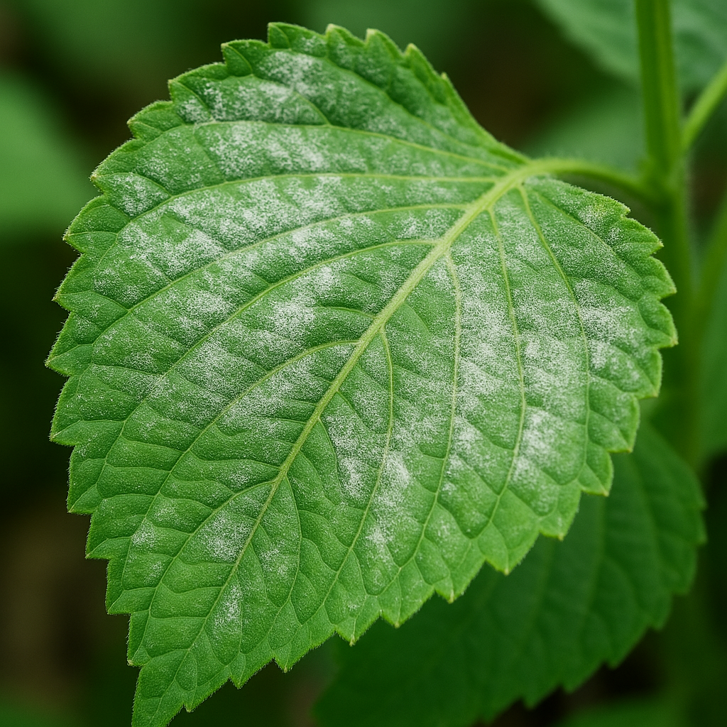 들깨 흰가루병은 곰팡이(균류)에 의해 발생하는 병으로, 들깨 잎 표면에 흰색 가루처럼 보이는 곰팡이 포자가 형성되는 것이 특징입니다.