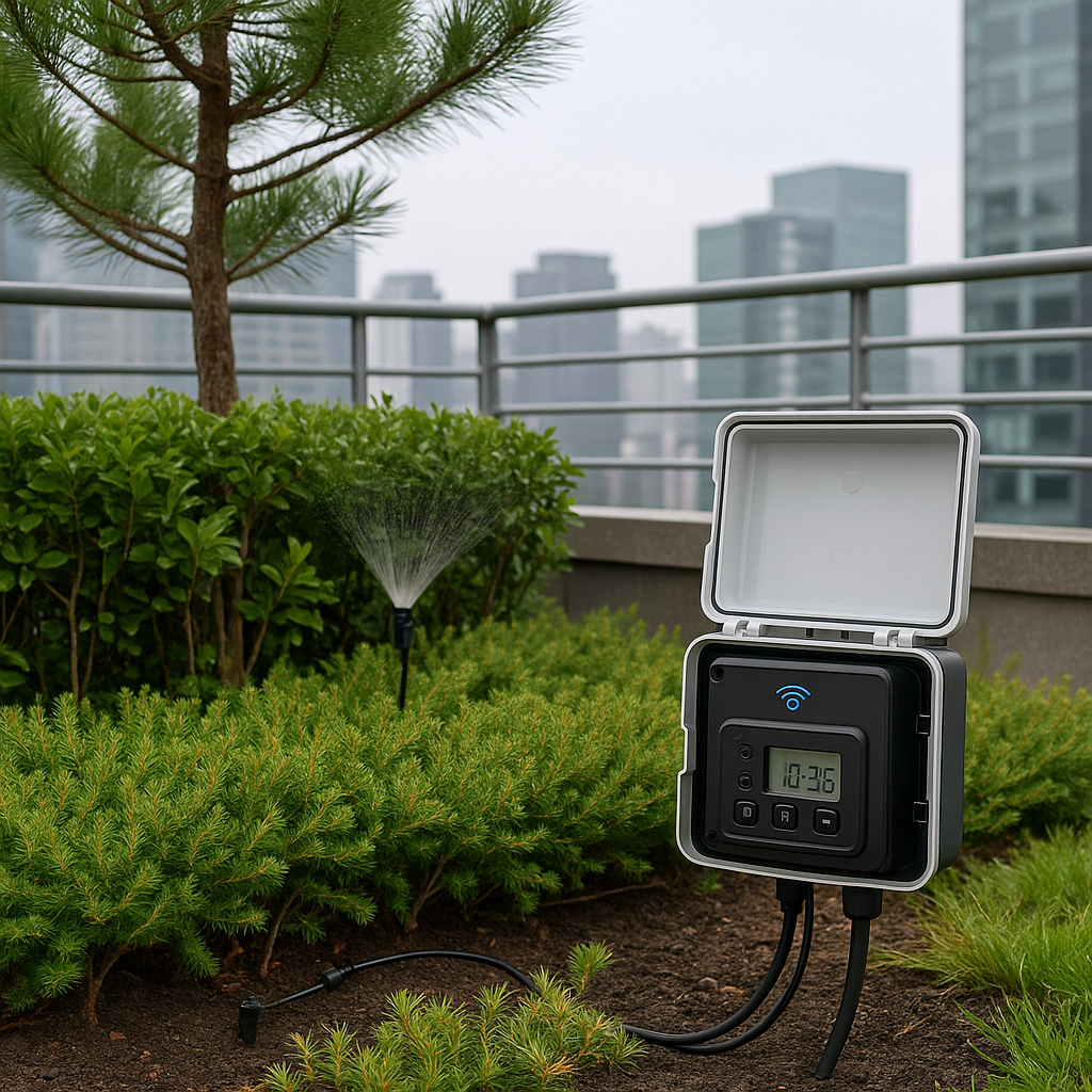 옥상에서는 무게를 줄이고 누수 위험을 낮추기 위해 주로 저압 드립라인 방식이 사용됩니다. 최근에는 스마트 IoT 제어 방식으로 발전해, 휴대폰 앱으로 제어하거나 실시간 모니터링이 가능한 제품들도 출시되고 있습니다.