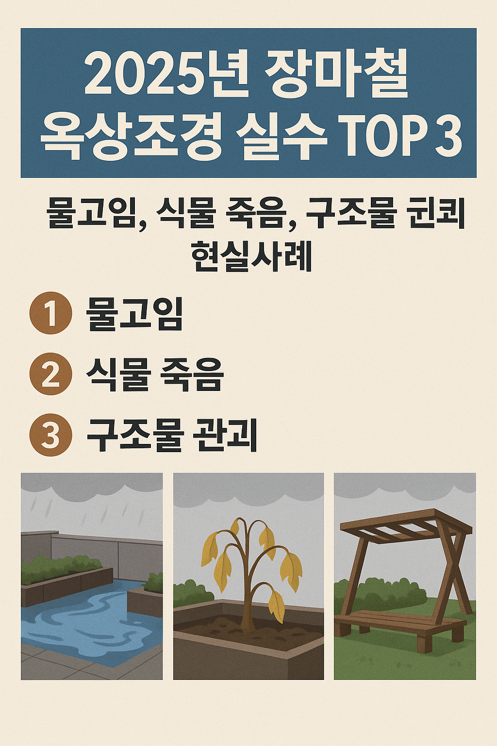 🌧️ 《2025년 장마철 옥상조경 실수 TOP3 – 물고임, 식물 죽음, 구조물 붕괴 현실사례》