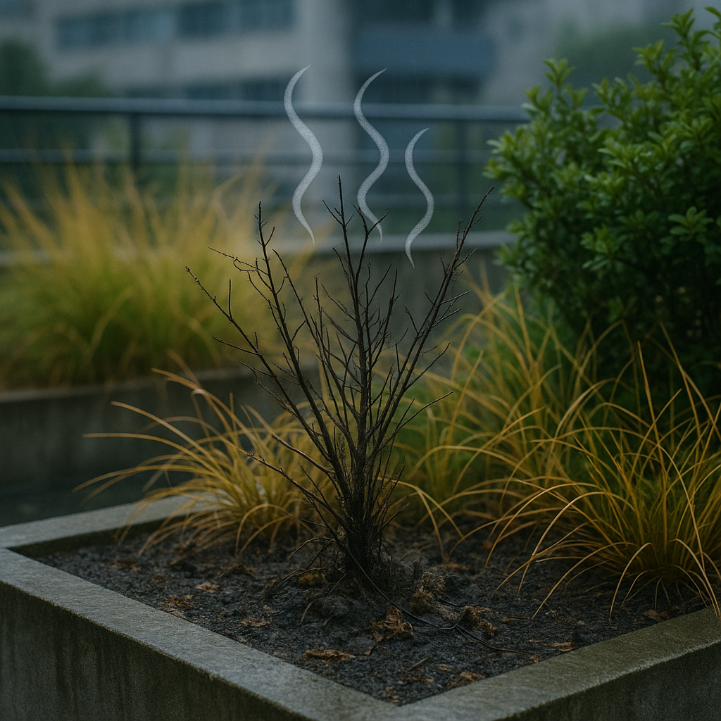 ❌장마철 옥상조경 실수 사례 2. 옥상 식재 문제 – 물에 잠긴 식물, 악취의 시작