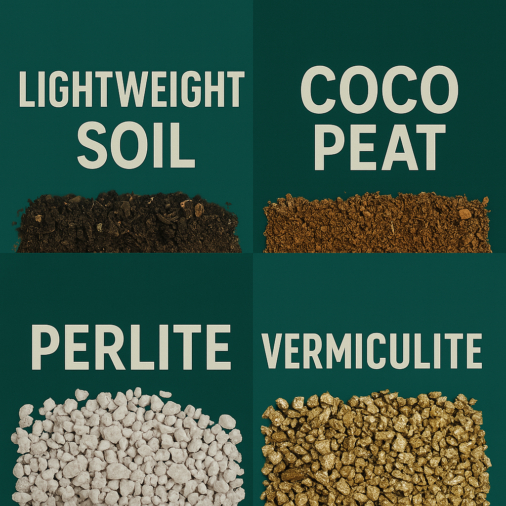 | 경량 토양 (복합 배합토) | 펄라이트 + 코코피트 + 부엽토 | 300~600kg/㎥ | 가볍고 배수 우수, 생육 안정 | 가격이 비쌈 |