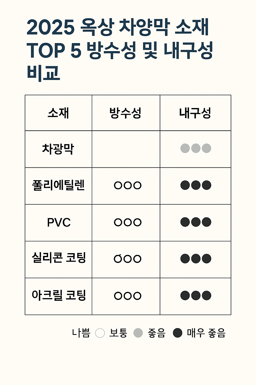 2025 옥상 차광막 추천 소재 TOP 5 – 내구성·방수성 완벽 비교표