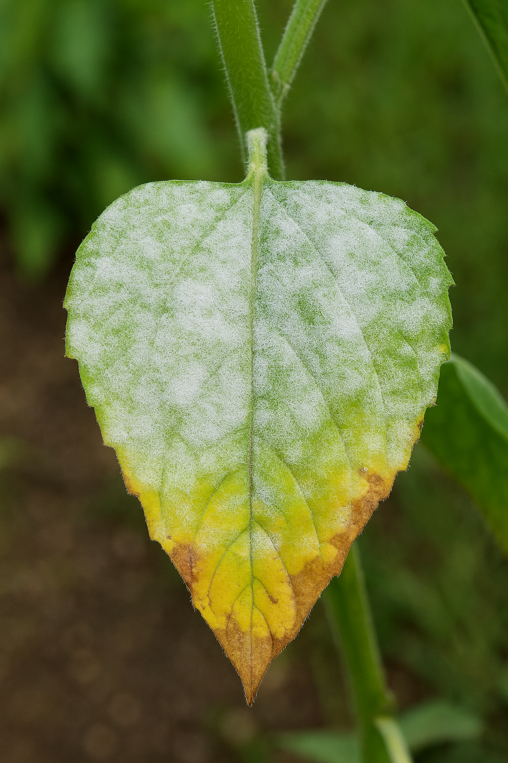 잎 뒷면부터 시작해 흰색 분말 같은 곰팡이층이 넓게 퍼짐
